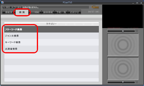 2. [検索]タブにある検索方法をクリックします。 3. 検索結果画面から録画予約したい番組を右クリックし、[録画/視聴予約]をクリックします。検索結果画面から番組表画面に戻るには、[番組表表示]をクリックしてください。