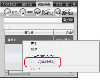 5. コピーする録画番組上で右クリックし、表示されたメニューから[ムーブ(携帯機器)]を選択します。