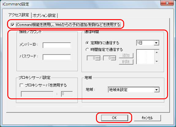 ¹àÌÜ ÆâÍÆiCommandµ¡Ç½¤ò»ÈÍѤ·¡¢Web¤«¤é¤ÎͽÌó/ºï½ü¤Ê¤É¤ò»ÈÍѤ¹¤ë iCommandµ¡Ç½¤ò»ÈÍѤ¹¤ë¾ì¹ç¤Ë¥Á¥§¥Ã¥¯¤òÉÕ¤±¤Þ¤¹¡£ ¥á¥ó¥Ð¡¼ID iCommand¥µ¡¼¥Ð¤ËÀܳ¤¹¤ëºÝ¤Î¥á¥ó¥Ð¡¼ID¤òÆþÎϤ·¤Þ¤¹¡£ ¥Ñ¥¹¥ï¡¼¥É iCommand¥µ¡¼¥Ð¤ËÀܳ¤¹¤ëºÝ¤Î¥Ñ¥¹¥ï¡¼¥É¤òÆþÎϤ·¤Þ¤¹¡£ ¥×¥í¥¥·¥µ¡¼¥Ð¤ò»ÈÍѤ¹¤ë iCommand¥µ¡¼¥Ð¤ËÀܳ¤¹¤ëºÝ¤Ë¥×¥í¥¥·¥µ¡¼¥Ð¤ò»ÈÍѤ¹¤ë¾ì¹ç¤Ï¡¢