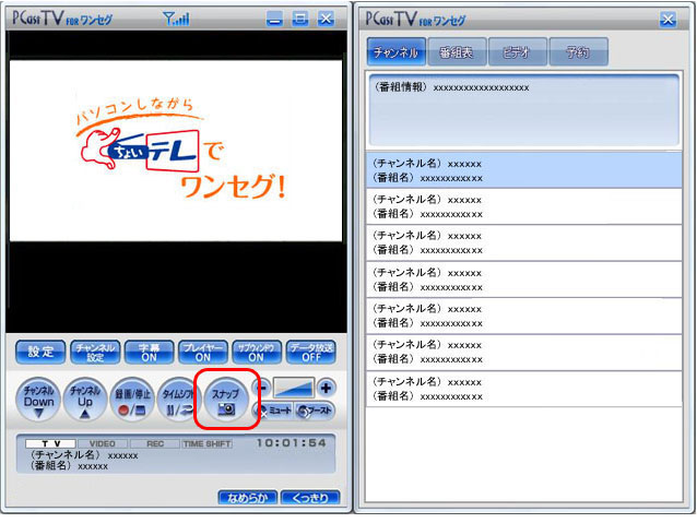 静止画をキャプチャする テレビを視聴している際に[スナップ]をクリックすると、静止画をキャプチャすることができます。 キャプチャした静止画は、初期状態ではマイドキュメント内の「マイピクチャ」に保存されます。 メモ: 静止画の保存先を変更したい場合は、PCastTV for ワンセグの設定画面([設定]をクリックすると表示されます)で設定をおこなってください。