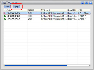 - [ムーブツール]をクリックしてムーブツールを起動します。 3. ムーブツールの[管理]をクリックします。4. ムーブ履歴の一覧が表示されます(現在接続されているメモリーカード内の