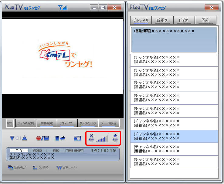 テレビを見る ■ チャンネルの切り替え チャンネルは、プレーヤーの[チャンネルDown]/[チャンネルUp]をクリックして切り替えます。 また、サブウィンドウの[チャンネル]タブをクリックし、一覧に表示されている各チャンネルをクリックすることでも切り替えることができます。 ■ 音量の調整 音量は アイコン上でマウスをドラッグすることで調整することができます。 [ミュート]をクリックすると、消音になります。 [ブースト]をクリックすると、音量を増幅します。