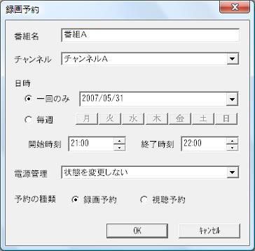 項目 内容 番組名 録画する番組名を入力します。 チャンネル 録画するチャンネルを入力します。 日時 録画する日時を指定します。