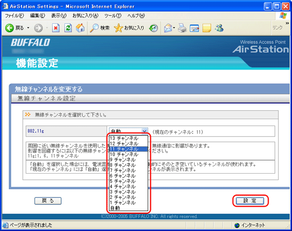 使用する無線チャンネルを選択して[設定]をクリックします。
