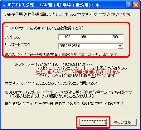 LAN端子用 無線子機(イーサネットコンバーター)のIPアドレスを入力して、[OK]をクリックします。