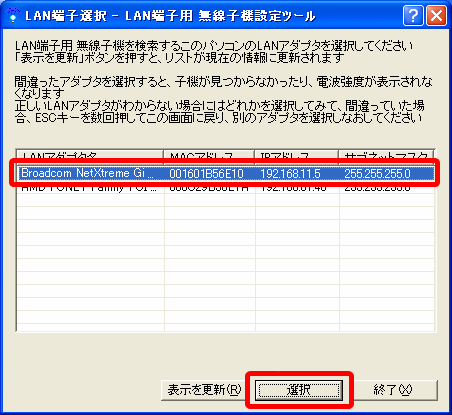 下の画面が表示されたときは、お使いのLANアダプタを選択して、[選択]をクリックします。