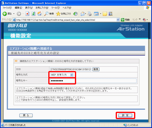 無線親機に暗号キーが設定されている場合は、暗号キーを入力し、[設定・接続]をクリックします。