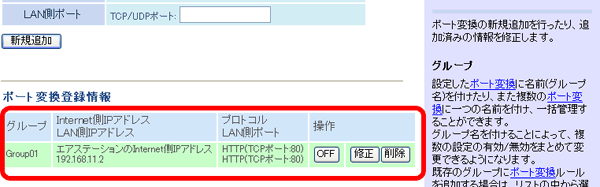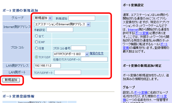 WWW(HTTP)サーバーを公開する場合は、以下のように設定すると、インターネットからのアクセスを任意のLAN側のWWWサーバーIPアドレスに転送できます。
