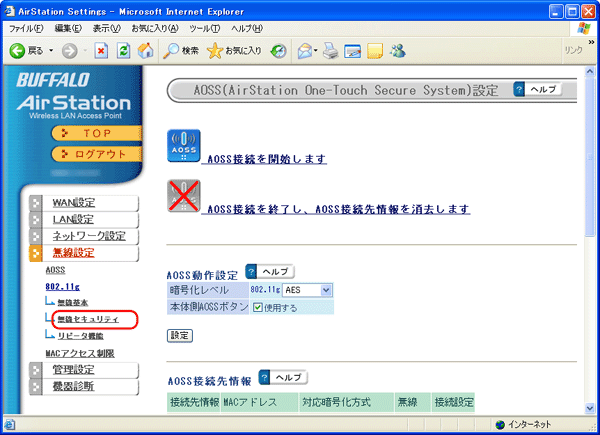 ※WHR-AM54G54/WHR-HP-AMPGシリーズの場合は、セキュリティを設定したい無線方式(802.11aまたは802.11g)の