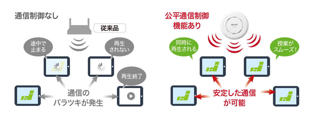 接続しているすべてのタブレットが均等に通信できるように速度を自動制御し、安定した無線LAN環境を実現します。すべての端末で無駄な待ち時間や動画の停止がないため、生徒の集中力を切らすことなく授業をスムーズに進めることができます。