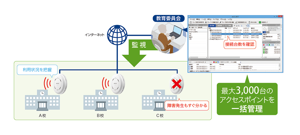バッファローの無線LANアクセスポイントでは、ネットワーク管理ソフトウェア「WLS-ADT/LW」によって、各学校のアクセスポイントへの接続台数や利用状況の把握、障害の状況など、トラブルの状態も即座に知ることができ、迅速な対応が可能になります。