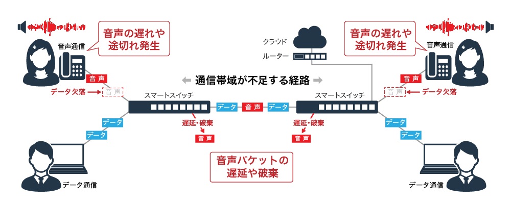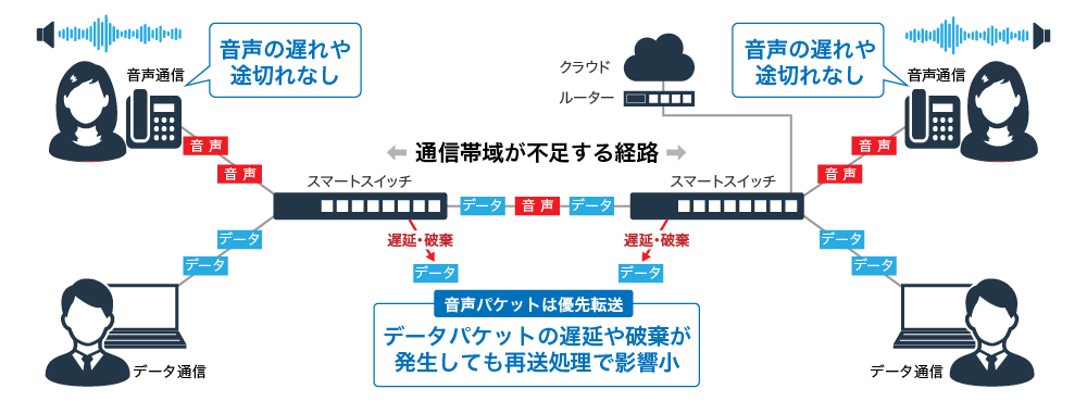 QoS(Quality of Service)とは、ネットワーク上でサービスの品質を確保するために通信の種別ごとの優先度付けを施す技術やしくみの総称です。オフィスネットワークでは、Web閲覧、メール、ファイル共有、音声通話、ビデオ会議など、さまざまなデータが同時に流れています。しかし、これらのデータは混雑すると、通信が遅れたり、途切れたりしてしまいます。特に、IP電話の音声通話やビデオ会議のように「リアルタイム性」が重要な通信は、少しの遅延や途切れでも大きな問題になります。QoSは、このような状況で特定の重要な通信を優先的に処理し、安定した品質を保つためのしくみです。例えるなら、高速道路で緊急車両が一般車両よりも優先して走行できるようなイメージです。これにより、限られたネットワークの帯域を賢く使い、利用者がストレスなくサービスを利用できるようにします。