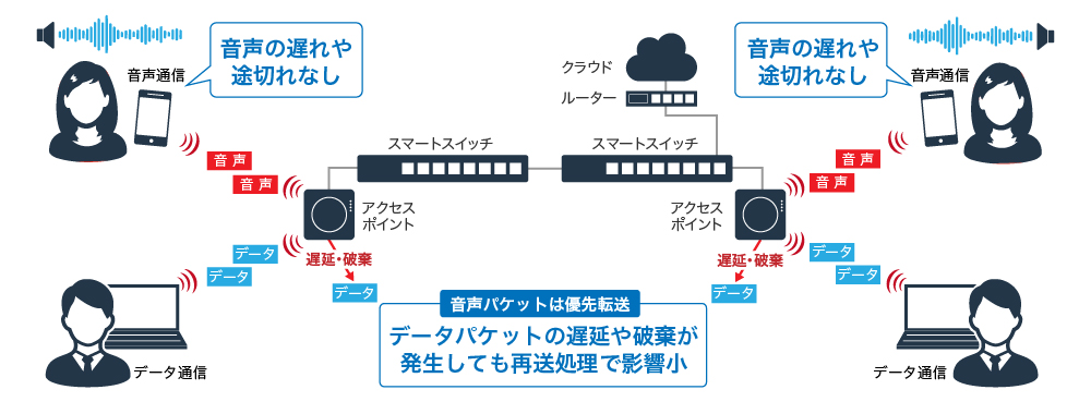 IEEE 802.11e規格でQoSが保たれるのはWi-Fi区間のみで、有線LAN部分へは「優先制御マッピング」により優先度が引き継がれます。