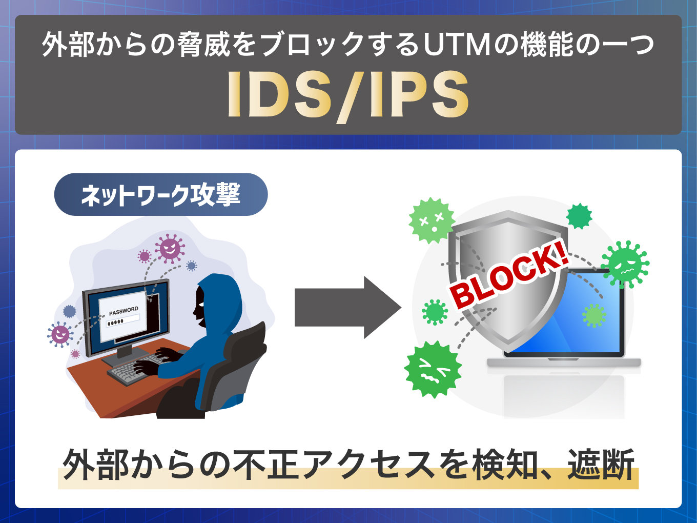 IDS(Intrusion Detection System)は外部からの不正な侵入を検知・通知する機能で「不正侵入検知システム」とも呼ばれます。IPS(Intrusion Prevention system)は検知後に通信を自動的に遮断し不正アクセスを防ぐ機能で「不正侵入防御システム」とも呼ばれます。IPSはIDSと比べてより迅速な対応が可能ですが、誤検知・誤遮断により業務に支障が発生する可能性がありますので、運用には注意が必要です。