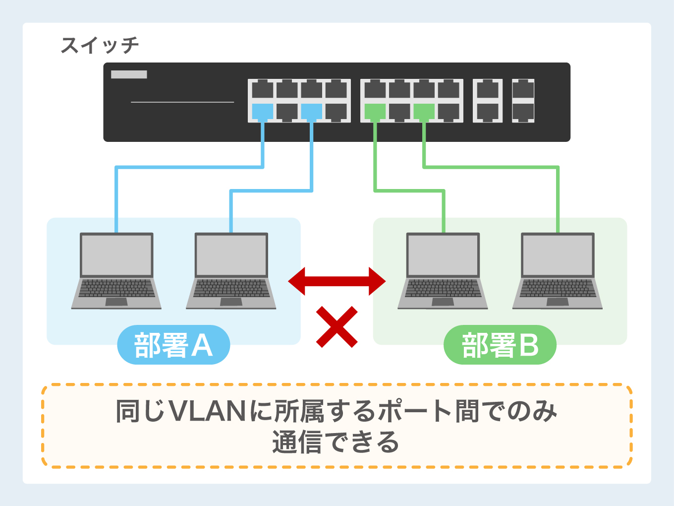 VLANを使用すると、ブロードキャストドメインを適切な大きさに分割できます。通常、ネットワーク上の各パソコンが送信するブロードキャストパケットは、すべての機器に届いてしまいます。しかしVLANでブロードキャストドメインを分割することで、ブロードキャストパケットの到達範囲が限定され、不要なトラフィックを抑制できます。