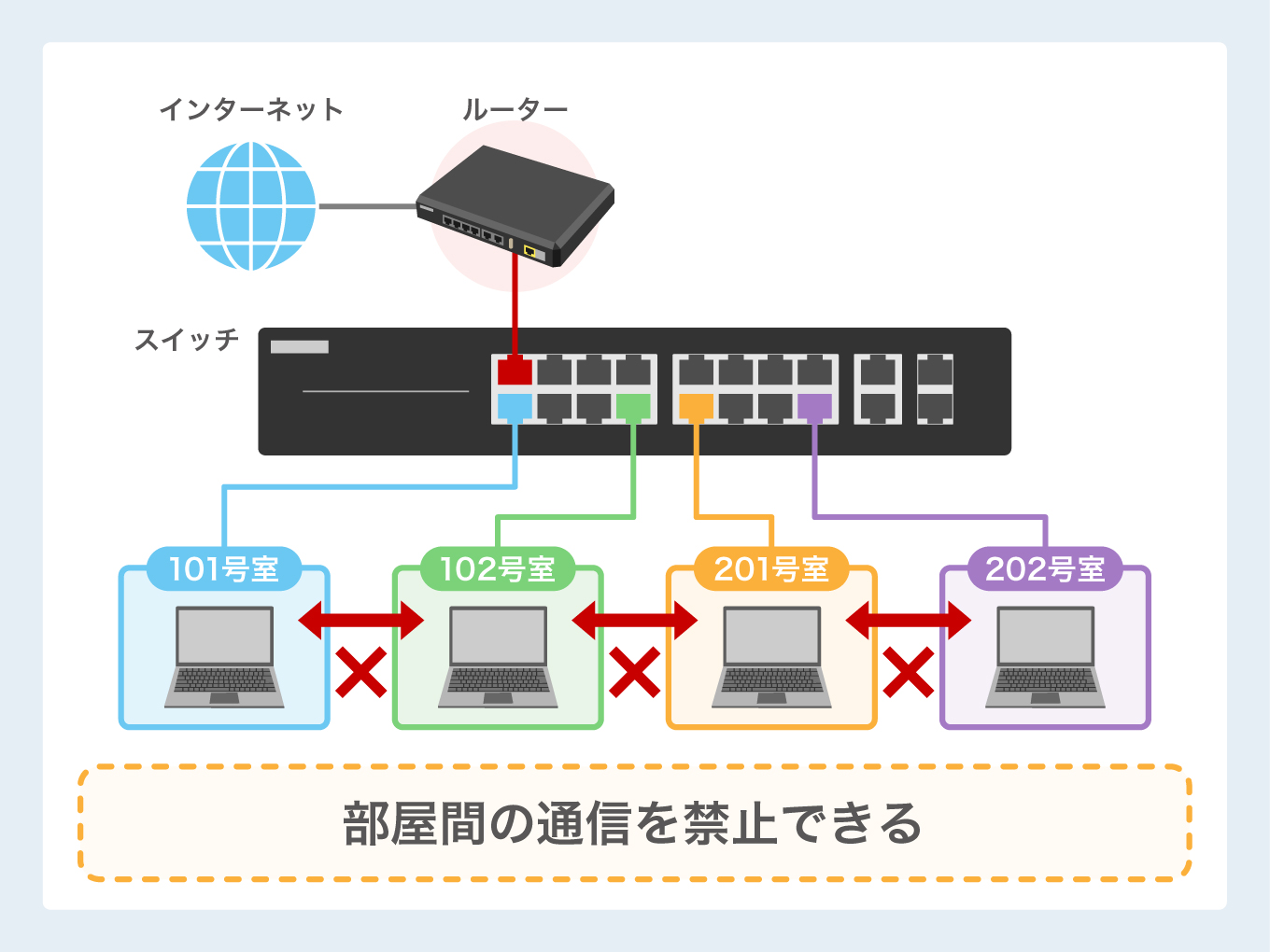 設定例として、マンション住人の部屋ではインターネットのみ接続可能とし、部屋間の通信は禁止する方法を紹介しています。詳細は以下をご参照ください。