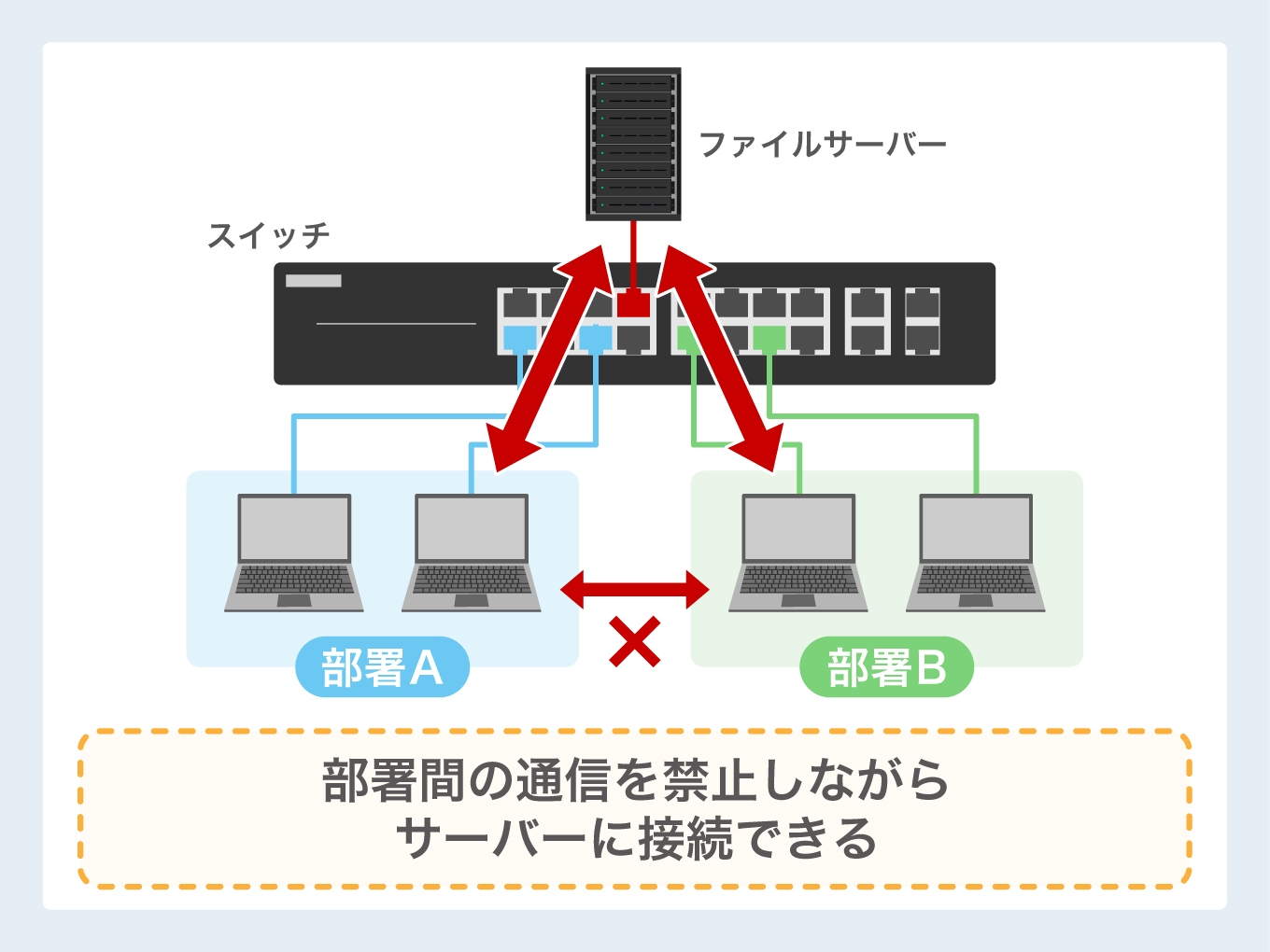 例えば下記の図のように部署間の直接通信は禁止しつつ、ファイルサーバーへのアクセスは許可するといった使い方が可能です。