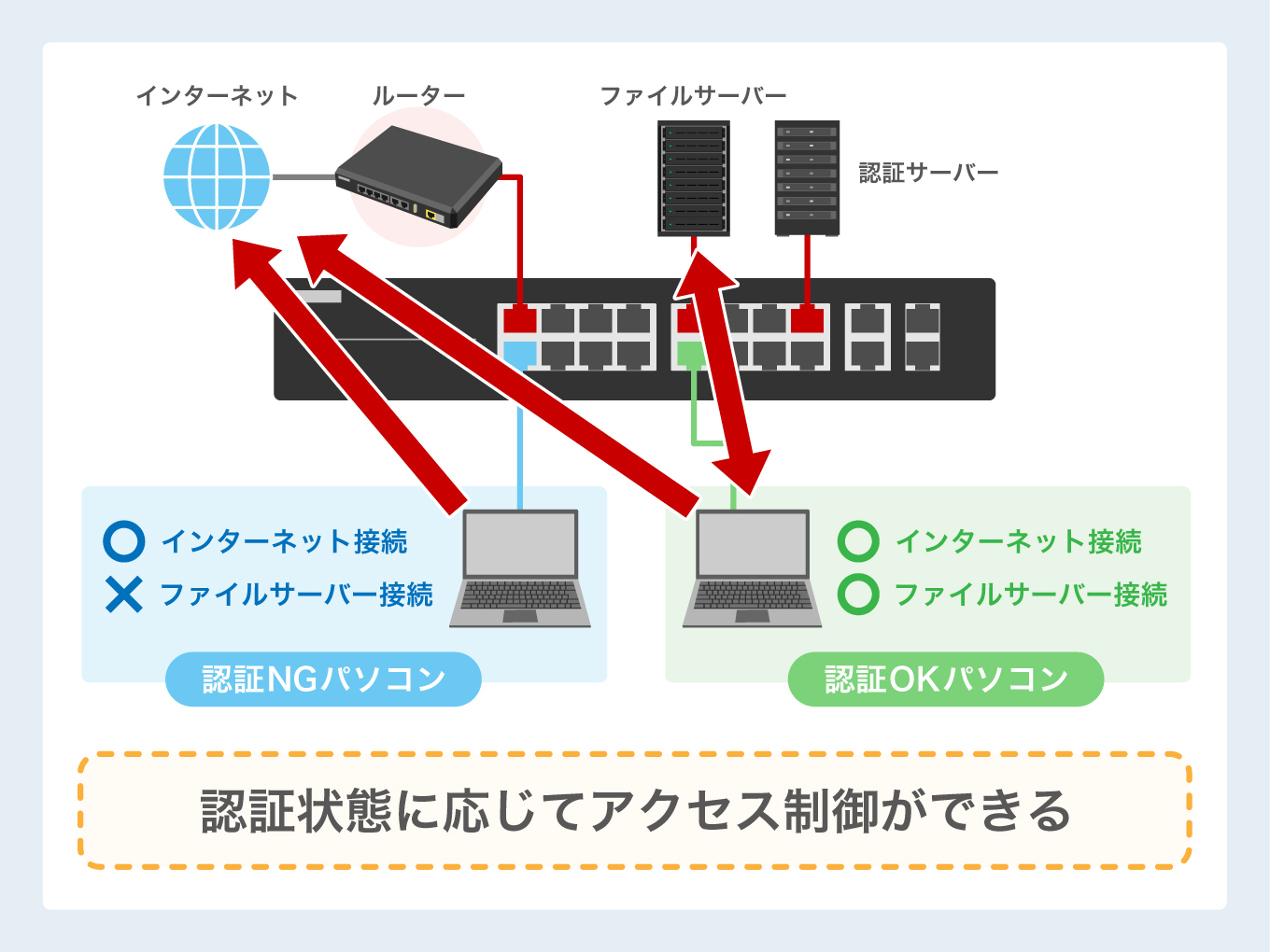 この動的なVLAN割り当ての仕組みは「ダイナミックVLAN」と呼ばれ、IEEE 802.1X認証を使用します。例えば、認証されたユーザーはファイルサーバーにアクセスでき、認証されないユーザーは「ゲストVLAN」に割り当てられてインターネットのみにアクセスできる、といった使い分けが可能です。
