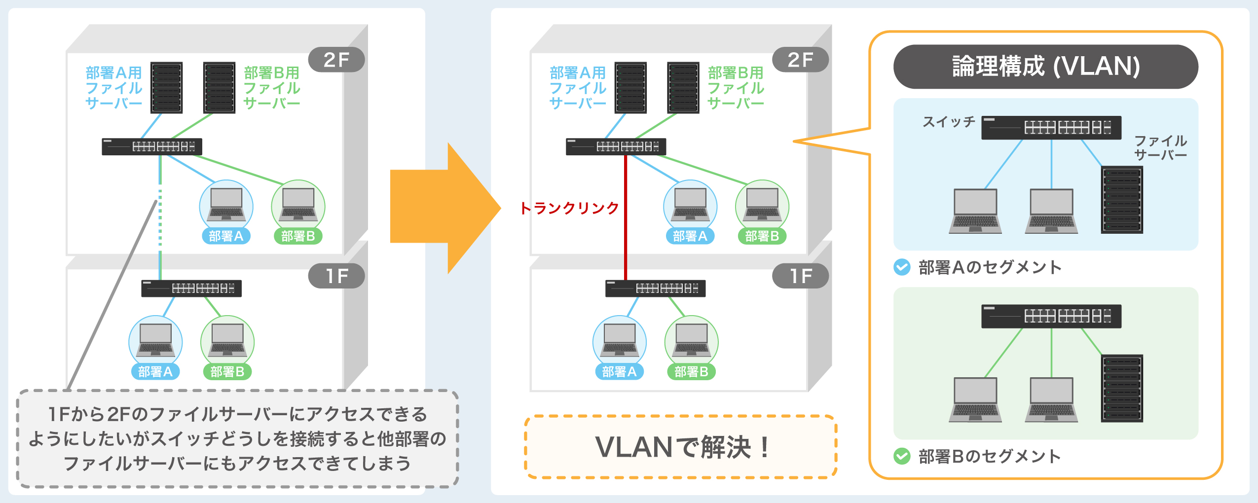 このケースでは物理的な制約により、各フロアの部署をまとめて1つのネットワークとして構築する必要がありました。そのため、異なるフロアに配置された同じ部署のメンバーどうしがネットワーク上で直接連携することができません。
