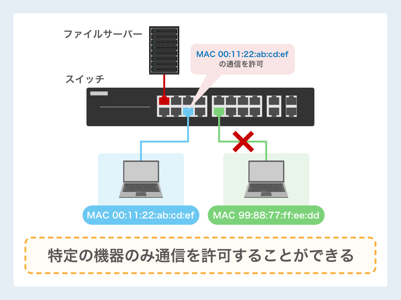 MACベースVLANは、端末のMACアドレスに基づいてVLANを割り当てる技術です。各端末のMACアドレスをあらかじめ認証サーバーに登録しておくことで、ネットワークに接続される機器を管理できます。