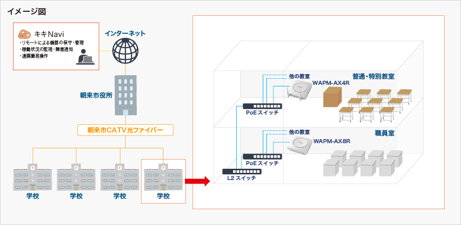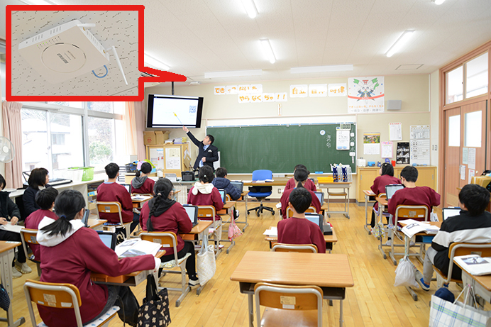 授業を行う普通教室・特別教室のほか、図書室や廊下などに「WAPM-AX4R」を設置。ローミング機能を有効化し、校内移動時も途切れない通信を可能にしている。将来を見据えて職員室には「WAPM-AX8R」を導入。Wi-Fi機器は「キキNavi」により教育委員会と保守会社が遠隔で一括管理している。