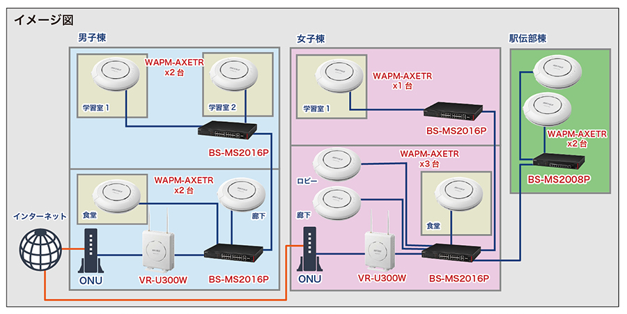 男子棟は事務室に、女子棟は寮母室にルーター「VR-U300W」とスイッチ「BS-MS2016P」を設置。それぞれ学習室と食堂に「WAPM-AXETR」を設置して、その中でのみWi-Fiを使用できるようにしている。女子棟から駅伝部棟には同じ回線を空中架線。