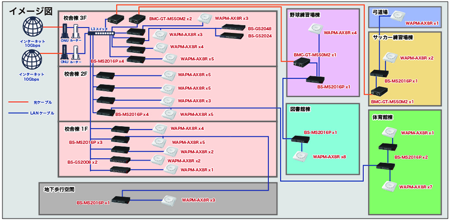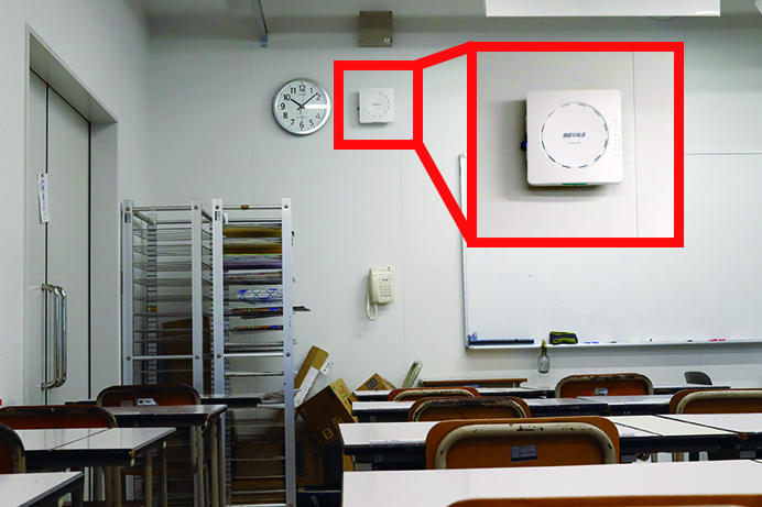 校舎棟には各教室に1台の「WAPM-AX8R」を設置。校舎棟1Fは校庭側の壁に設置したことで、校庭の一部でもWi-Fiの使用が可能になった。トレーニングルームのある地下歩行空間、体育館棟、図書館棟、野球練習場、サッカー練習場棟横にある弓道場にも同様にアクセスポイントを設置した。