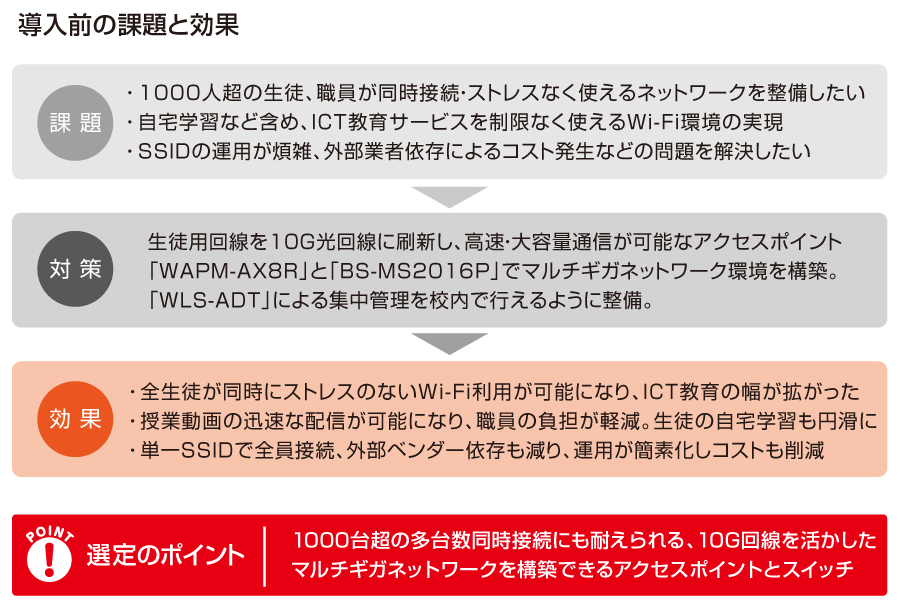 体育館や別棟など校内全域でWi-Fi接続が可能となり、授業や学校行事でのICT活用が柔軟に。運用も大幅に楽になりコストも削減できました
