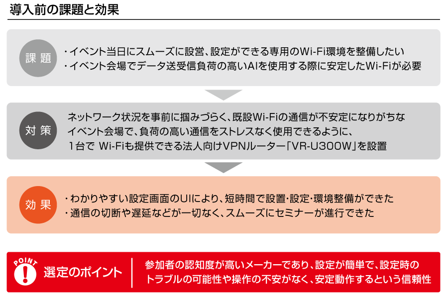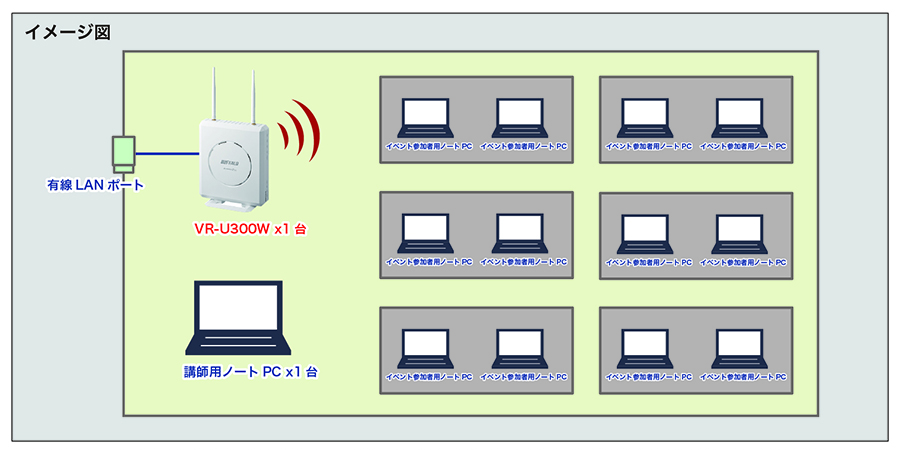 イベント会場におけるハンズオンイベントの専用ネットワーク構築機器にVR-U300Wを採用。素早く設定できて安定したWi-Fi環境を実現