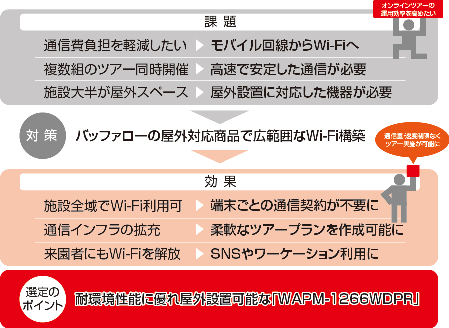 コロナ禍での集客対策として導入したオンラインツアーの運用効率化に向け、施設全域でWi-Fi接続可能なネットワーク環境を構築