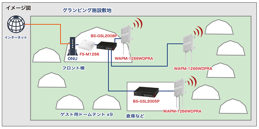 フロント棟と倉庫にスイッチを設置し、架線は台風や風雨に備えて地中に埋没。通信トラブルが発生した場合、販売店からの遠隔監視(機器管理システム)によりエラーを検知し、必要に応じて電気工事業者が対応する体制を整えている。