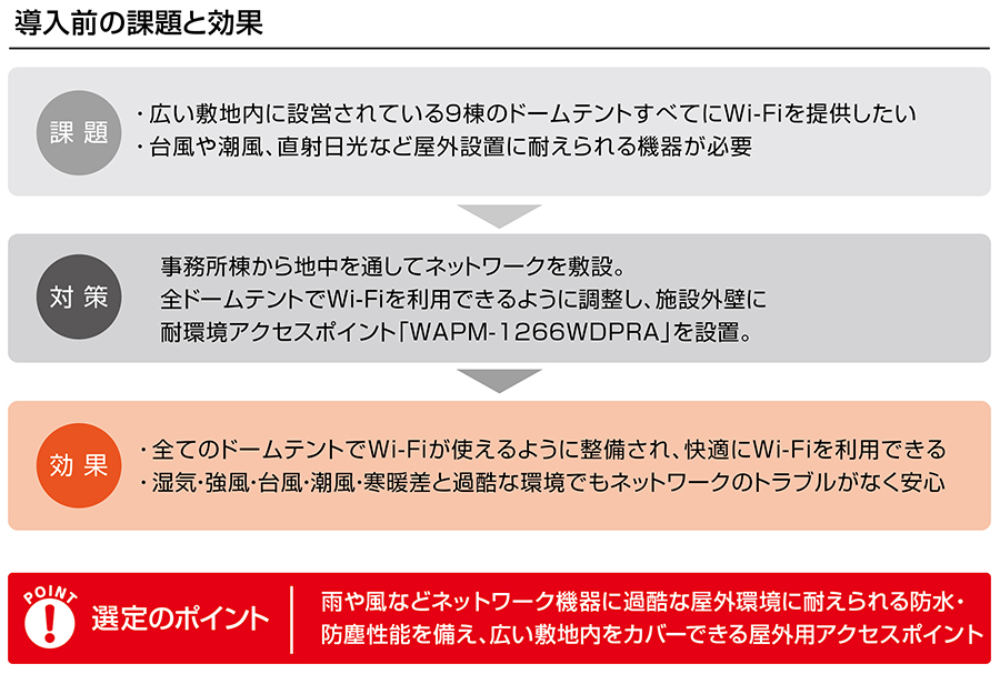 ネットワーク機器に過酷な環境でも、施設の利用者にとって「Wi-Fiはあって当たり前」。不便を感じさせない環境を実現