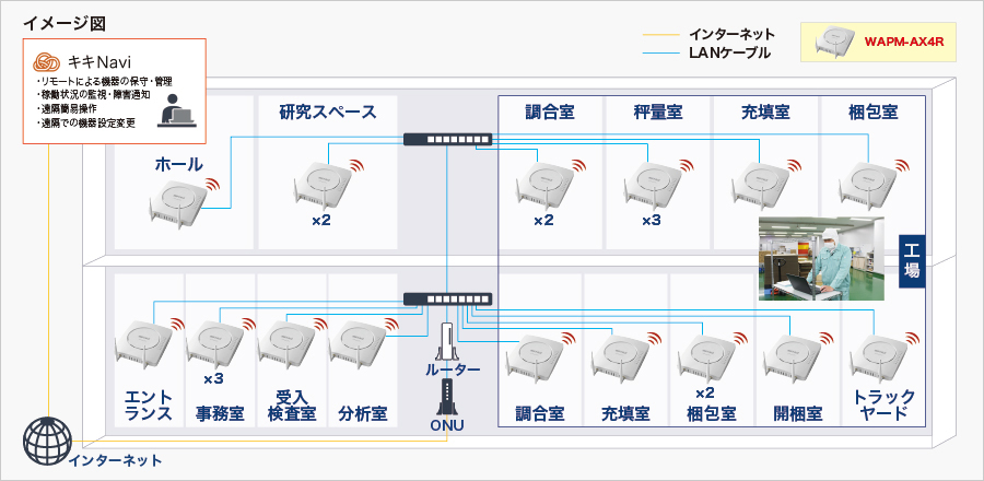 高速通信規格Wi-Fi 6(11ax)対応の「WAPM-AX4R」を用いて新社屋全域のWi-Fi環境を整備。「AP間電波自動調整機能」と「ローミング支援機能」を有効化し、端末を持って移動しても通信が途切れない環境を実現。Wi-Fi機器の管理には「キキNavi」を活用している。