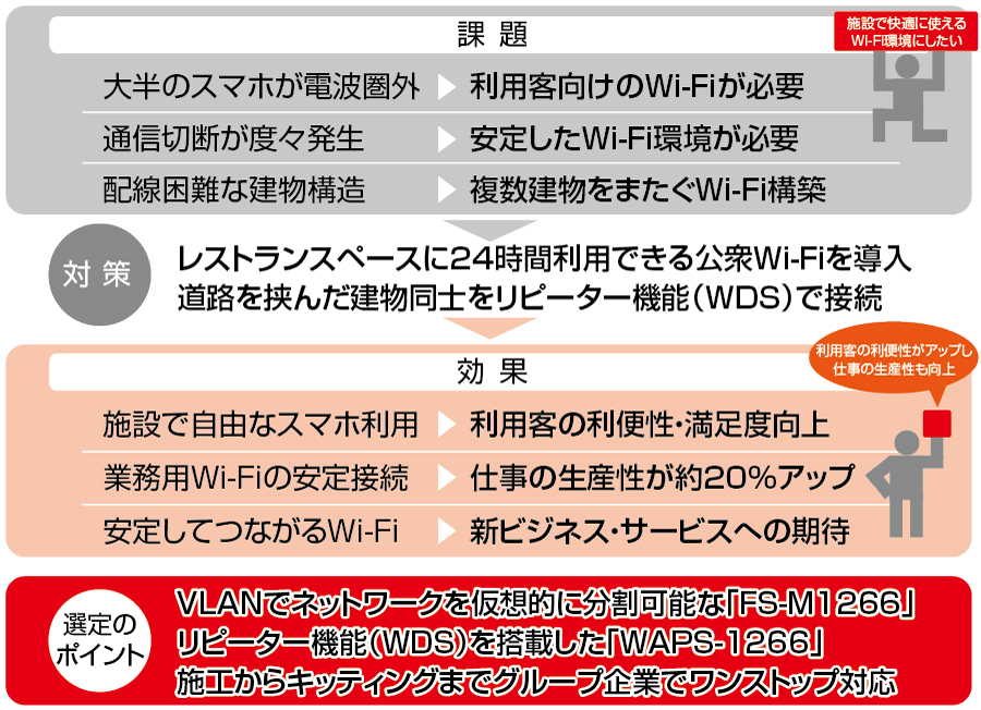 利用客の利便性・満足度向上と業務用Wi-Fiの安定化を目的に、FREESPOT導入キットと無線LANアクセスポイントで新たなネットワーク環境を構築