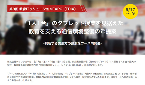 株式会社バッファローは、5/17日(水)~19日(金)の3日間、東京国際展示場(東京ビッグサイト)にて開催される日本最大の学校・教育関係者向けIT専門展「第8回教育ITソリューションEXPO(EDIX)」に出展いたします。 ブースでは無線LAN(Wi-Fi)を活用し、「1人1台環境」「タブレット授業」「屋内外全校整備」等を実践されている学校・教育委員会の先生方の講演を開催。無線LAN活用例や教育現場でのトラブル事例・解決策もご覧いただけます。当社ブースへのご来場、心よりお待ち申し上げます。