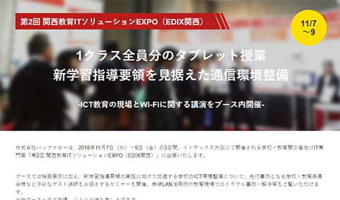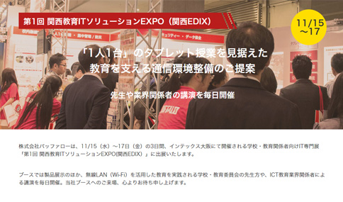 株式会社バッファローは、2018年11月7日(水)~9日(金)の3日間、インテックス大阪にて開催される学校・教育関係者向けIT専門展「第2回 関西教育ITソリューションEXPO(EDIX関西)」に出展いたします。