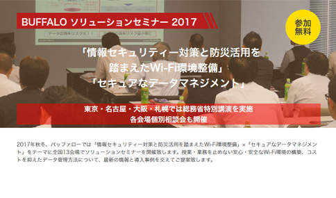 東京・名古屋・大阪・札幌では総務省特別講演を実施 各会場個別相談会も開催 2017年秋冬、バッファローでは「情報セキュリティー対策と防災活用を踏まえたWi-Fi環境整備」×「セキュアなデータマネジメント」をテーマに全国13会場でソリューションセミナーを開催致します。授業・業務を止めない安心・安全なWi-Fi環境の構築、コストを抑えたデータ管理方法について、最新の情報と導入事例を交えてご提案致します。