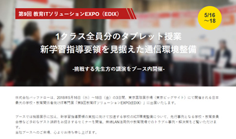 株式会社バッファローは、2018年5月16日(水)~18日(金)の3日間、東京国際展示場(東京ビッグサイト)にて開催される日本最大の学校・教育関係者向けIT専門展「第9回教育ITソリューションEXPO(EDIX)」に出展いたします。 ブースでは機器展示に加え、新学習指導要領の実施に向けて加速する学校のICT環境整備について、先行事例となる学校・教育委員会様など多彩なゲスト講師をお招きするセミナーを開催。無線LAN活用例や教育現場でのトラブル事例・解決策をご覧いただけます。 当社ブースへのご来場、心よりお待ち申し上げます。