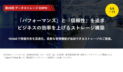 株式会社バッファローは、2018年5月9日(水)~11日(金)の3日間、東京国際展示場(東京ビッグサイト)にて開催される「Japan IT Week 春」内『第20回データストレージEXPO』に出展いたします。
