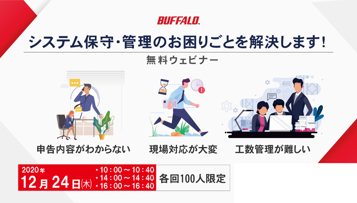 ひとり情シス運用セミナー2019 ~Windows 10 移行を機会に、働き方改革を加速~ Windows 7 のサポート終了まで半年となり、Windows 10 移行も本格化しておりますが、このPC更新の機会を社内の「働き方改革」の強化のきっかけにしている企業も多く見受けられます。 株式会社バッファローは、日本電気株式会社様が主催するセミナー「ひとり情シス運用セミナー2019」を、日本マイクロソフト株式会社様と共催いたしますので、皆さまにご来場いただきたくご案内致します。 本セミナーではWindows 10切替を活かした働き方改革のモデルケースや情報システム担当者の運用負担を軽減する運用のポイントについて、ご紹介いたします。