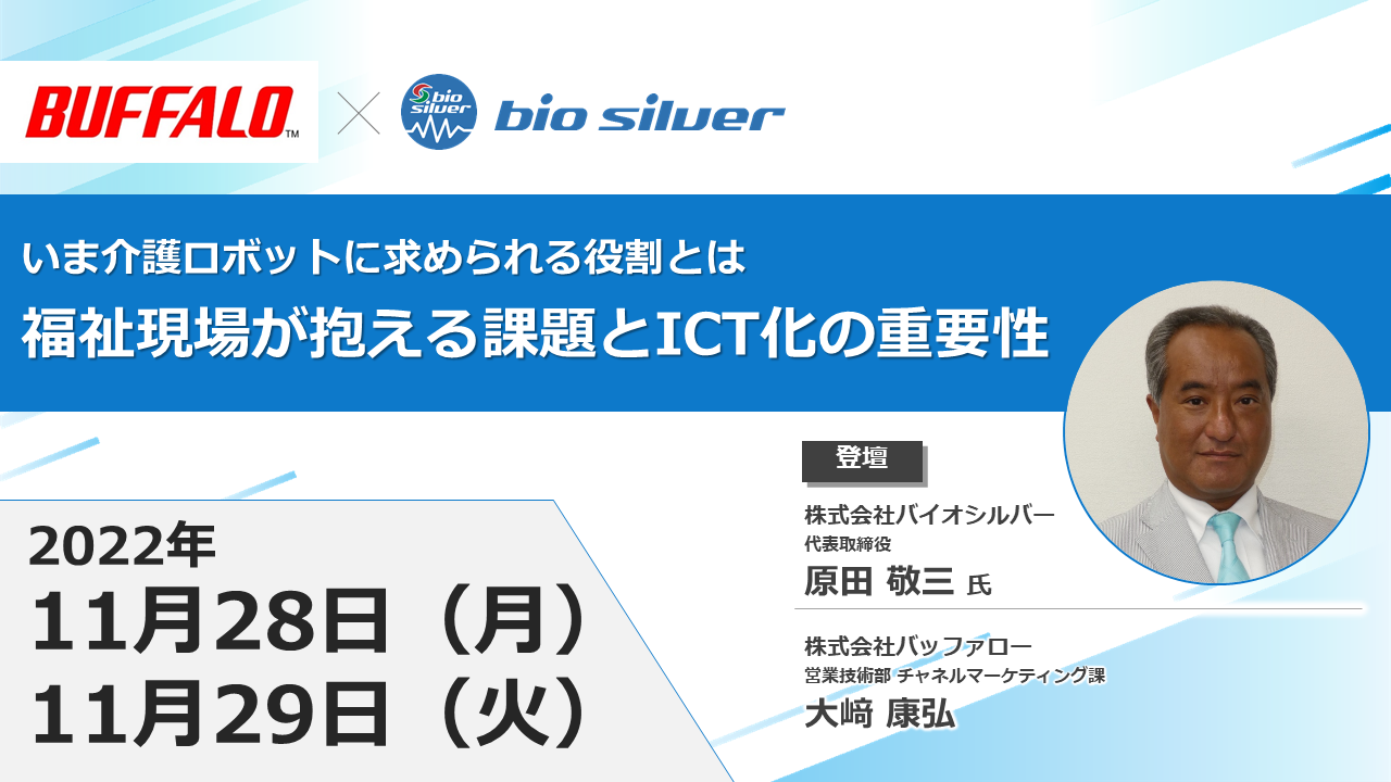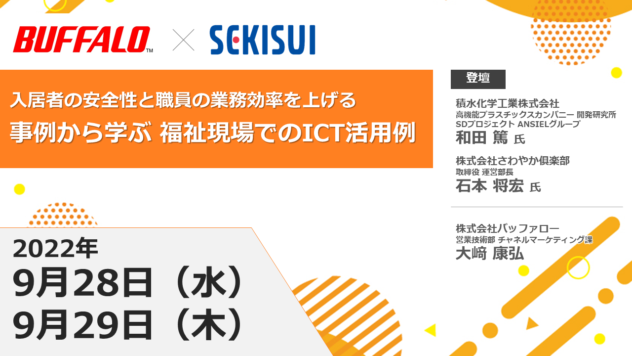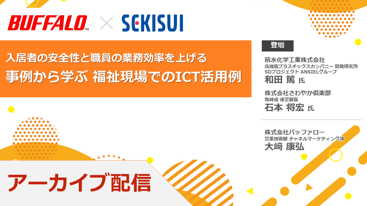 株式会社バッファローは2024年10月9日(水)~10月11日(金)までインテックス大阪にて開催される「CareTEX大阪」へ出展いたします。 ブースでは、見守り業務を支援する『見守り支援システム』、それらを繋げるWi-Fi環境の構築をメインに、介護施設様のICT化を支援する製品・サービスをご紹介いたします。その他にも介護施設様で対策が義務化されているBCP対策や、業種・規模問わず対策が必要なランサムウェア対策などソリューションのご案内も行います。 介護機器メーカー様との相互検証実施など、安心してご利用いただけるための取り組みを行っており、多数の介護施設様へ導入実績がございます。機器選定から導入・保守まで一括でご提案させていただきます。当社ブースへのご来場を、心よりお待ち申し上げております。