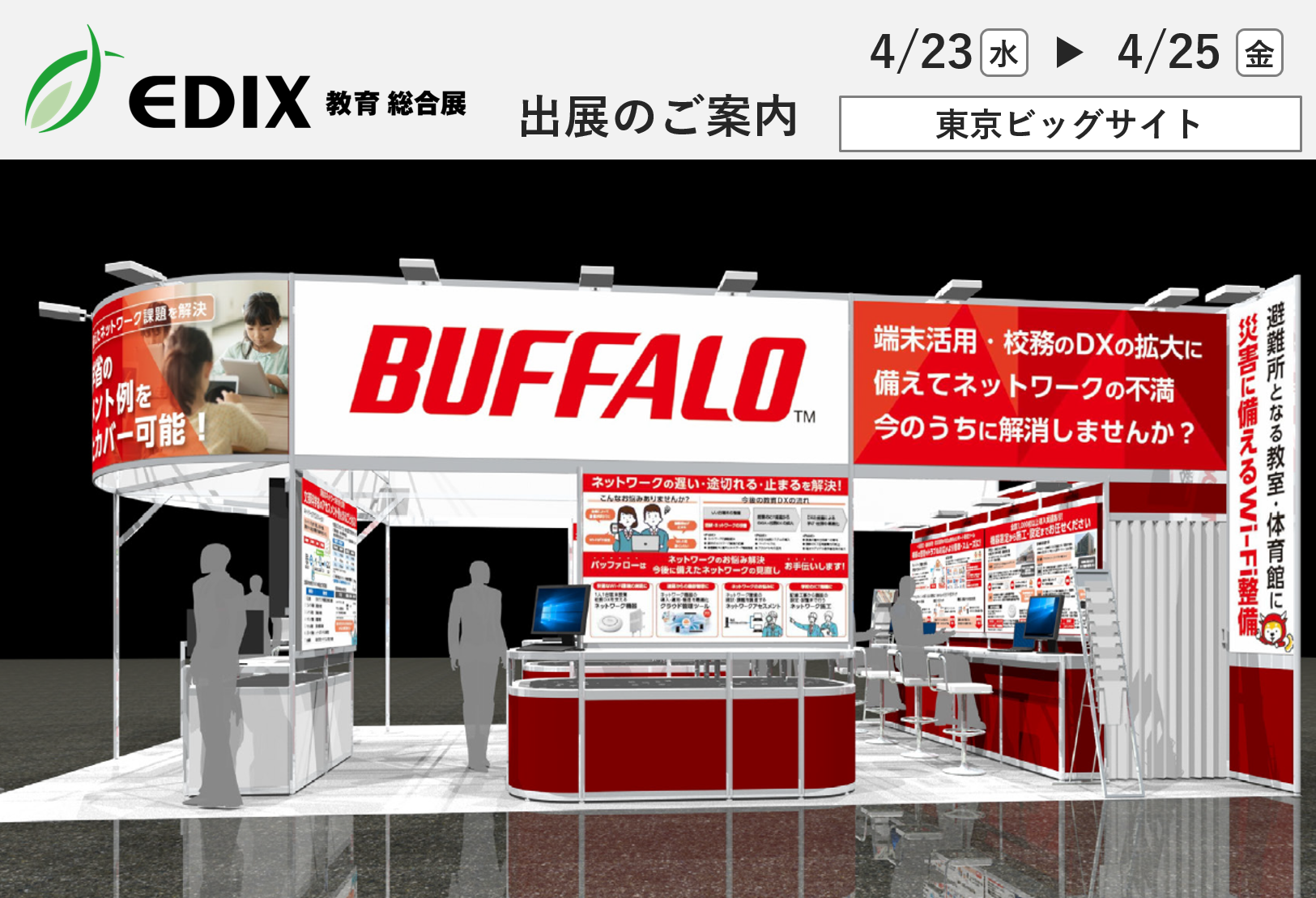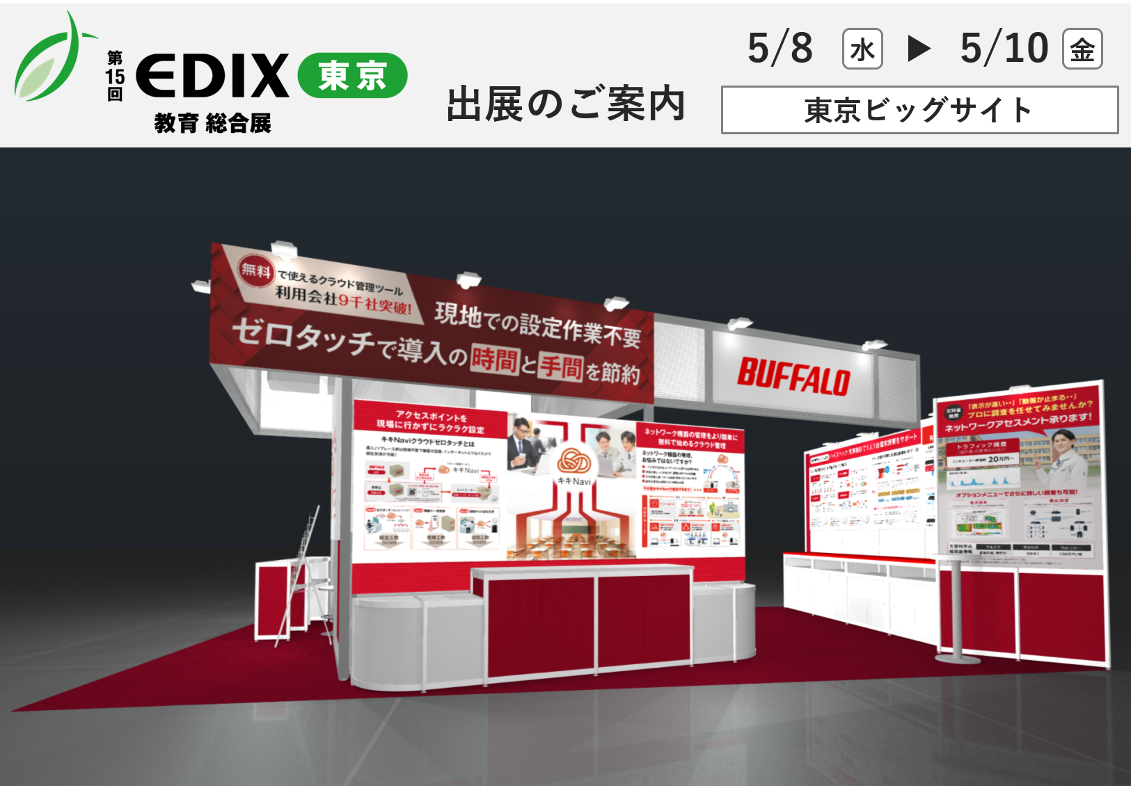 株式会社バッファローは2024年5月8日(水)~5月10日(金)まで東京ビッグサイトにて開催される「第15回 EDIX(教育総合展)東京」へ出展いたします。 ブースでは文部科学省の補助金対象となっているネットワークアセスメントサービスのご紹介、端末の入れ替えに併せた各種サプライ製品の展示等を行います。また、授業を途切れさせない安定した通信を実現するネットワーク製品、機器の一括管理を支援する無料のクラウド管理ツールなどもご紹介いたします。 国内メーカーである強みを生かし、補助金を活用したネットワーク環境の調査、端末に関連したサプライ製品の入れ替えなど、手厚くご支援させていただきます。当社ブースへのご来場を、心よりお待ち申し上げております。