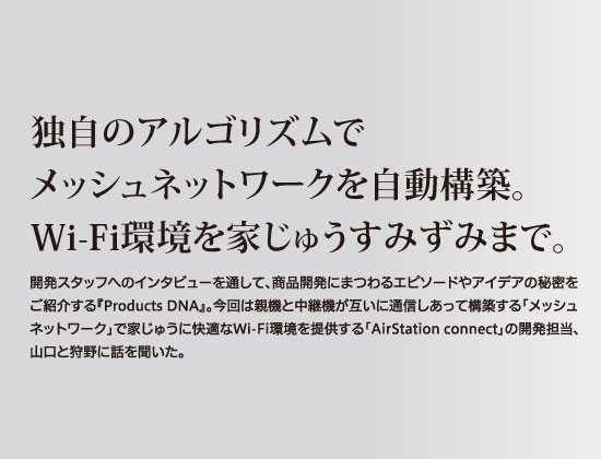 山口:現代はパソコンやスマートフォン、テレビはもちろん、ロボット掃除機やエアコンなど、さまざまな機器がネットワークにつながるIoT時代です。これらの機器は家のどこで使われるのか決まっているものばかりではありません。リビング、ダイニング、ベッドルーム…、あらゆる場所で機器が使われる可能性があります。つまり、ネットワークとつながる最先端の機器類を最大限に活用するためには、宅内の特定の場所ではなく、あらゆる場所に電波が届いていなくてはならないわけです。しかも従来に比べより高速で強い電波が求められるようになっています。例えばスマートフォンやタブレット、パソコンなどを利用した動画の視聴。現在では4K動画をはじめとした高解像度で情報量の多い動画コンテンツが次々とリリースされています。こうしたコンテンツをストレスなく楽しむためには、「ただ届いている」だけではなく高速な電波が高い強度を保って届いている必要があります。 「AirStation connect」は、そうした現代社会のニーズに応える商品群です。親機と中継機が互いに通信しあいながら「メッシュネットワーク」と呼ばれる通信網を構築することで、家じゅうのすみずみまで快適なWi-Fi環境を届けるものです。