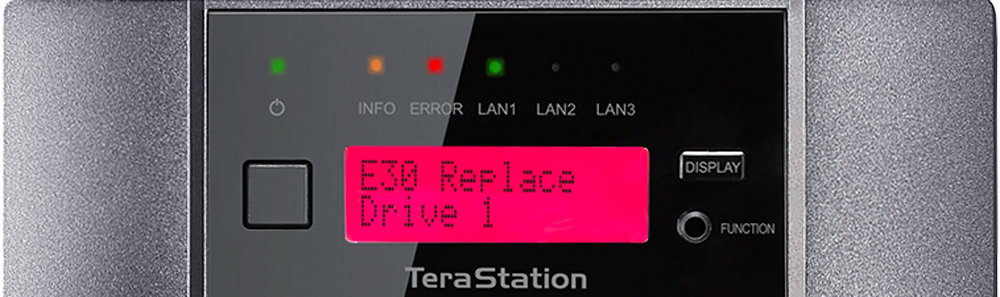 お使いのNASがバッファロー製TeraStation(テラステーション)/LinkStation(リンクステーション)の場合は、ランプや液晶ディスプレイによってエラーコードを確認することができます。たとえばE14は「RAIDアレイがマウントできない状態」、E30は「ドライブがRAIDアレイから外された状態」で、いずれもHDD/SSDが故障している可能性があります。