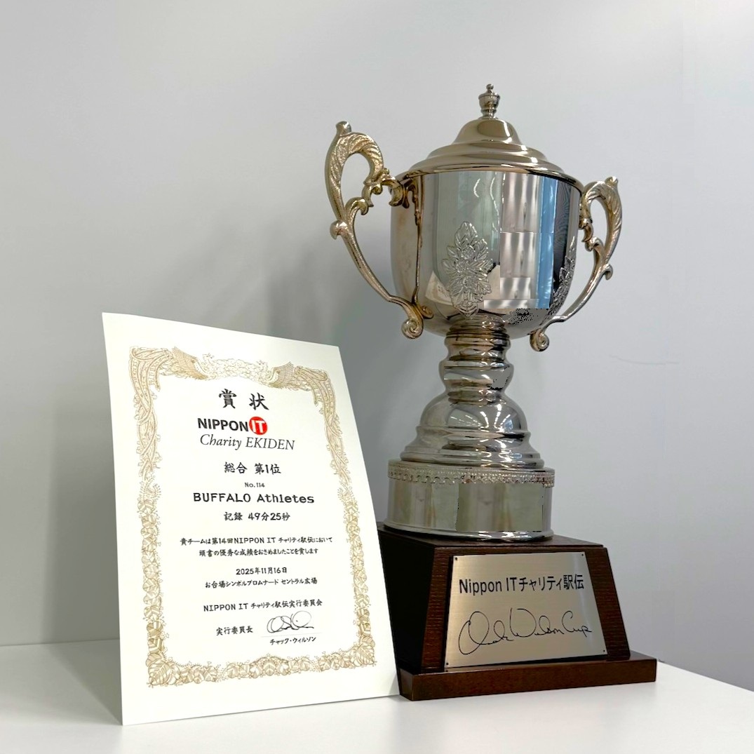 株式会社バッファロー(本社:東京都千代田区、代表取締役 社長執行役員CEO:牧 寛之、以下バッファロー)は、2025年11月16日(日)にお台場 シンボルプロムナード公園 セントラル広場(東京都江東区)にて開催された「第14回 NIPPON IT チャリティ駅伝(以下「当駅伝」という)」に参加し、スペシャルゼッケンスポンサーとして協賛いたしました。当駅伝では昨年よりもさらに大規模になった3,105人ものランナー、621のチームが参加するなか、バッファローならびにグループ会社から代表して19チーム・95名のランナーが、それぞれのテーマと目標を掲げて出場し、そのうち「BUFFALO Athletes」チームが当社では初の総合1位入賞を果たしました。