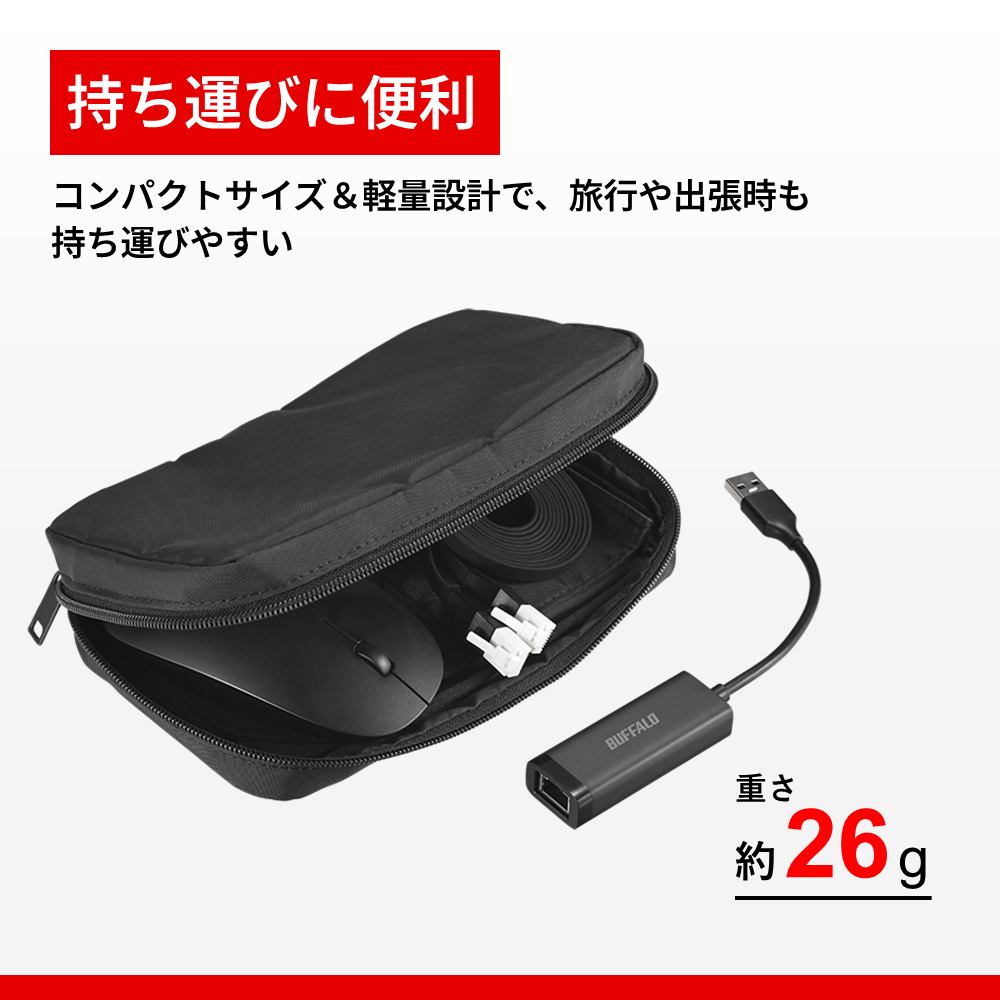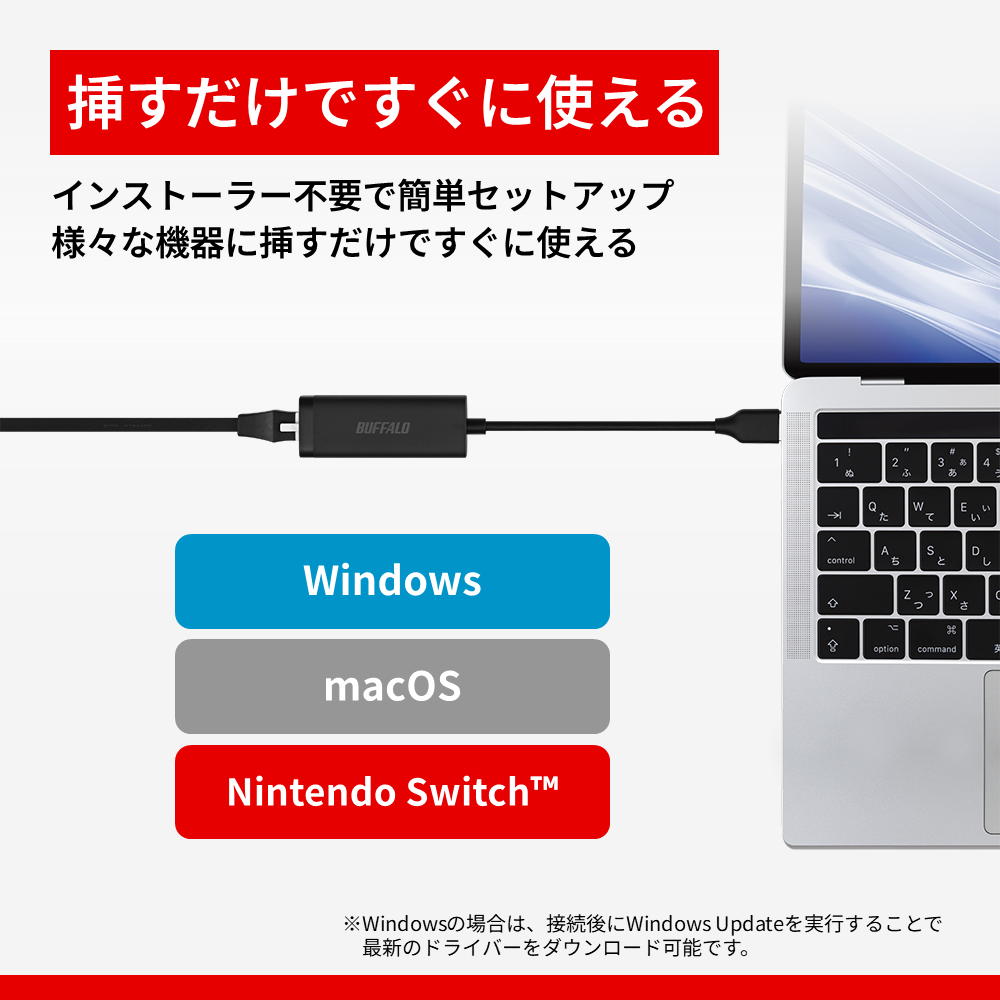本商品はLANポートのない機器でUSB端子に接続することで有線LANを使用することができる有線LANアダプターです。Wi-Fiが不安定な場所で有線LANを利用したいときや、有線LAN環境しかない場所でインターネットを利用したいときに、USB Type-CまたはType-A端子に接続することで便利にお使いいただけます。インストーラー不要で、挿すだけですぐに使用できます。