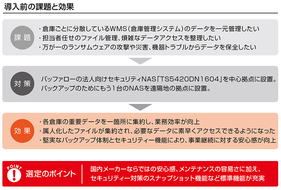 導入事例:物流・倉庫管理のデータサーバーをバッファローのセキュリティNASにリプレース。データの一元管理とBCP対策を実現
