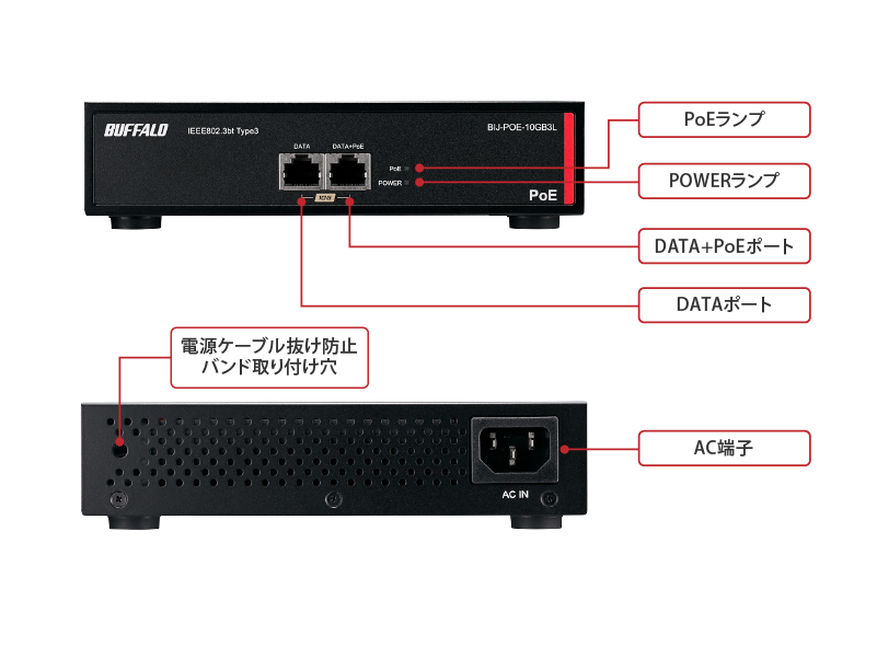 | 適合ケーブル | 10BASE-T UTP/STPカテゴリー3以上のLANケーブル 100BASE-TX UTP/STPカテゴリー5以上のLANケーブル 1000BASE-T/2.5GBASE-T/5GBASE-T UTP/STPカテゴリー5e以上のLANケーブル 10GBASE-T UTP/STPカテゴリー6A以上のLANケーブル ※DATA+PoEポートに接続するケーブルは、UTP/STPカテゴリー5e以上の4対のLANケーブルを使用してください。 |