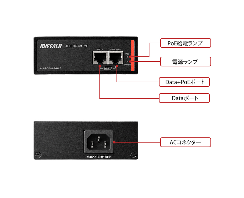 | ポート数 | 10M/100M/1000M /2.5G: 1CH(RJ-45コネクター) ※1CH(入力(Hub側)/出力(PD側)の2ポート一対) ※PoE給電のみでスイッチング機能はありません。別途スイッチングHubが必要となります。 |