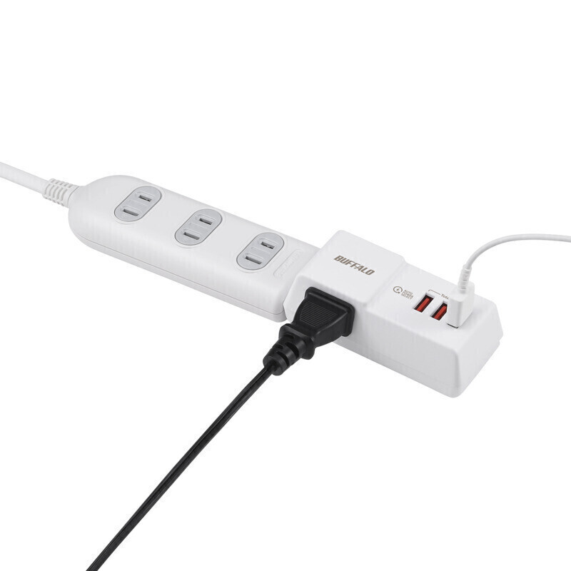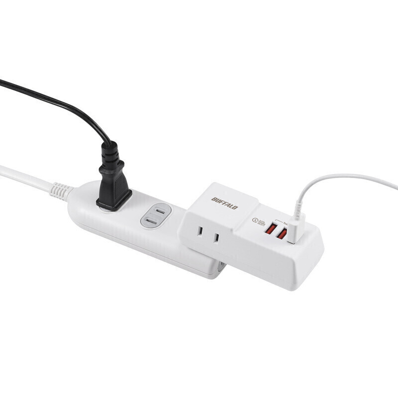 USB充電対応機器を家庭用コンセントからダイレクトに充電できる3ポートタイプのUSB充電器に、2個口の電源コンセントを配置。コンセントを塞ぎにくいタテ型デザイン。合計2個の電源コンセント※を使用可能です。
